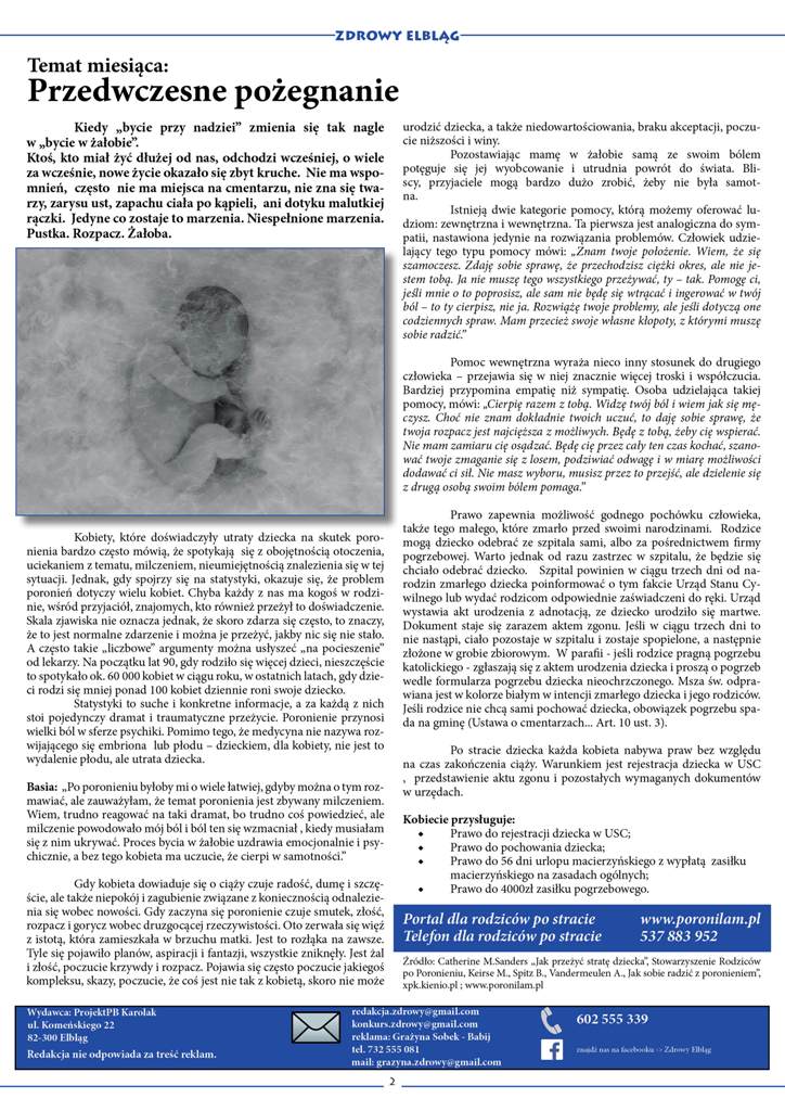W lipcowym wydaniu magazynu „Zdrowy Elbląg” pojawił się artykuł „Przedwczesne pożegnanie”. Mamy nadzieję, że dzięki takim publikacjom więcej rodziców znajdzie pomoc i będzie mogła skorzystać z praw, które im przysługują po poronieniu. W artykule pojawiła się też wzmianka o naszym portalu Poroniłam.pl