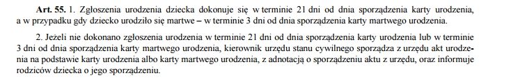 Artykuł 55 ustęp 1 „Zgłoszenia urodzenia dziecka dokonuje się w terminie 21 dni od dnia sporządzenia karty urodzenia, a w przypadku gdy dziecko urodzi się martwe – w terminie 3 dni od dnia sporządzenia karty martwego urodzenia”
